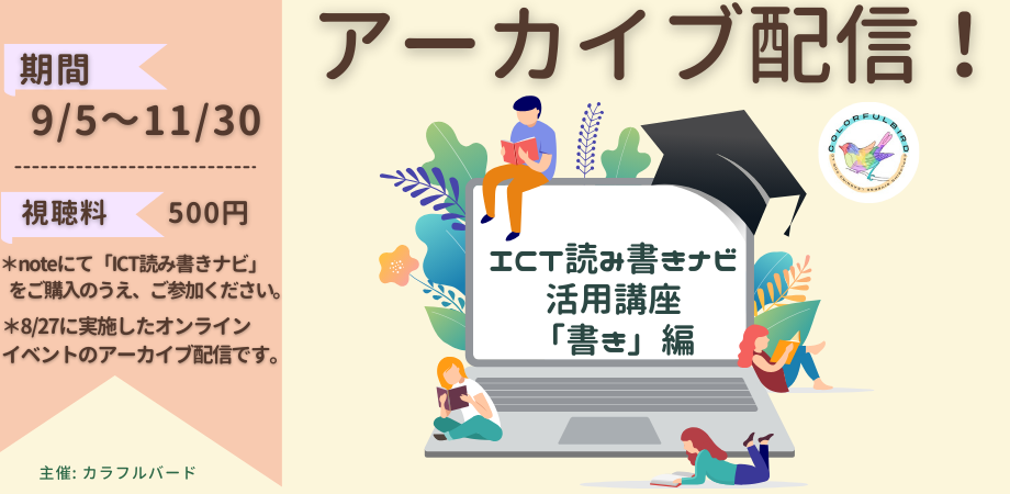 📘「ICT読み書きナビ」活用講座~「書き」編~【アーカイブ配信】 「読み書きを助ける」ICTの使い方を一緒に学んでみませんか? カラフルバードではこれまで、『ICT読み書...