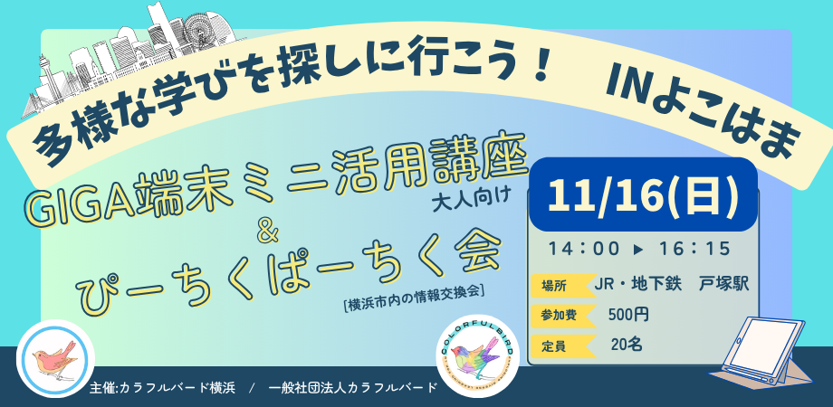 GIGA端末ミニ活用講座(大人向け) & ぴーちくぱーちく会(横浜市内の情報交換会) キックオフイベントのため、今回は大人向けとしてのGIGA端末ミニ講座の開催で...