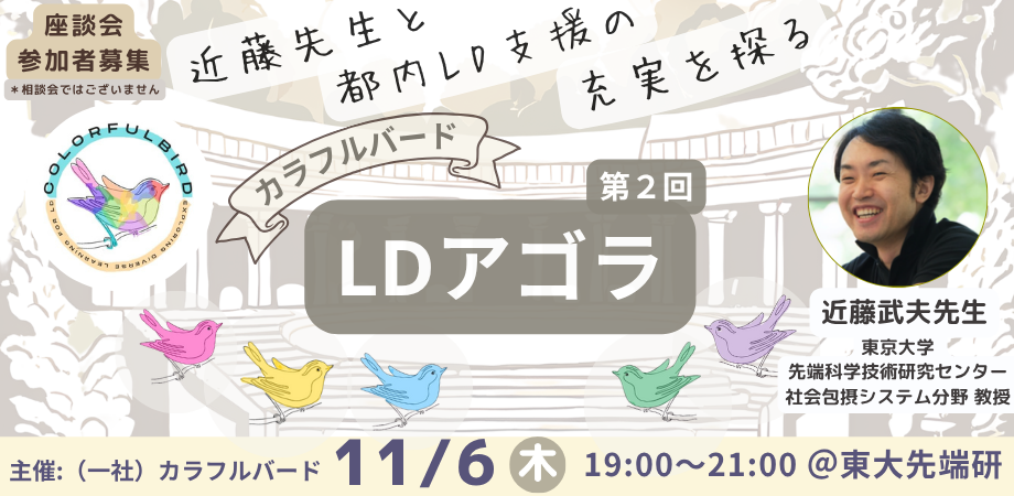 第2回 カラフルバードLDアゴラ ~近藤先生と都内のLD支援の充実を探る~ 東大先端研の近藤武夫先生と、都内におけるLD(学習障害)支援の充実を探る座談会を開催します。L...