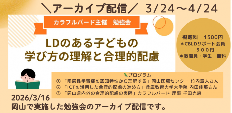 🎥アーカイブ配信🎥~カラフルバード主催勉強会「LDのある子どもの学び方の理解と合理的配慮」~ 3月15日に岡山で実施した本勉強会。大変ご好評をいただき、「アーカイブで...
